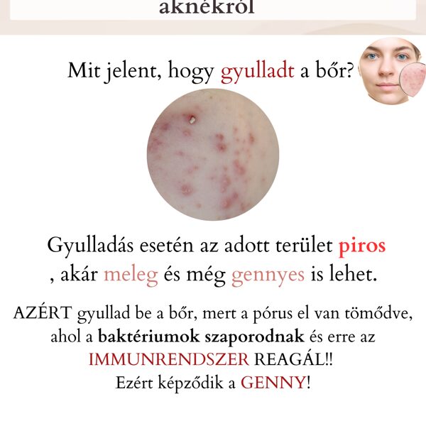 mint az oxigenizálás, savas hámlasztás, a bőrfelszín erősítése...) a bőr egyensúlyának visszanyeréséhez, hogy megelőzzük a maradandó piros foltokat, hegeket és megelőzzük az erős gyógyszerek alkalmazásának szükségességét!